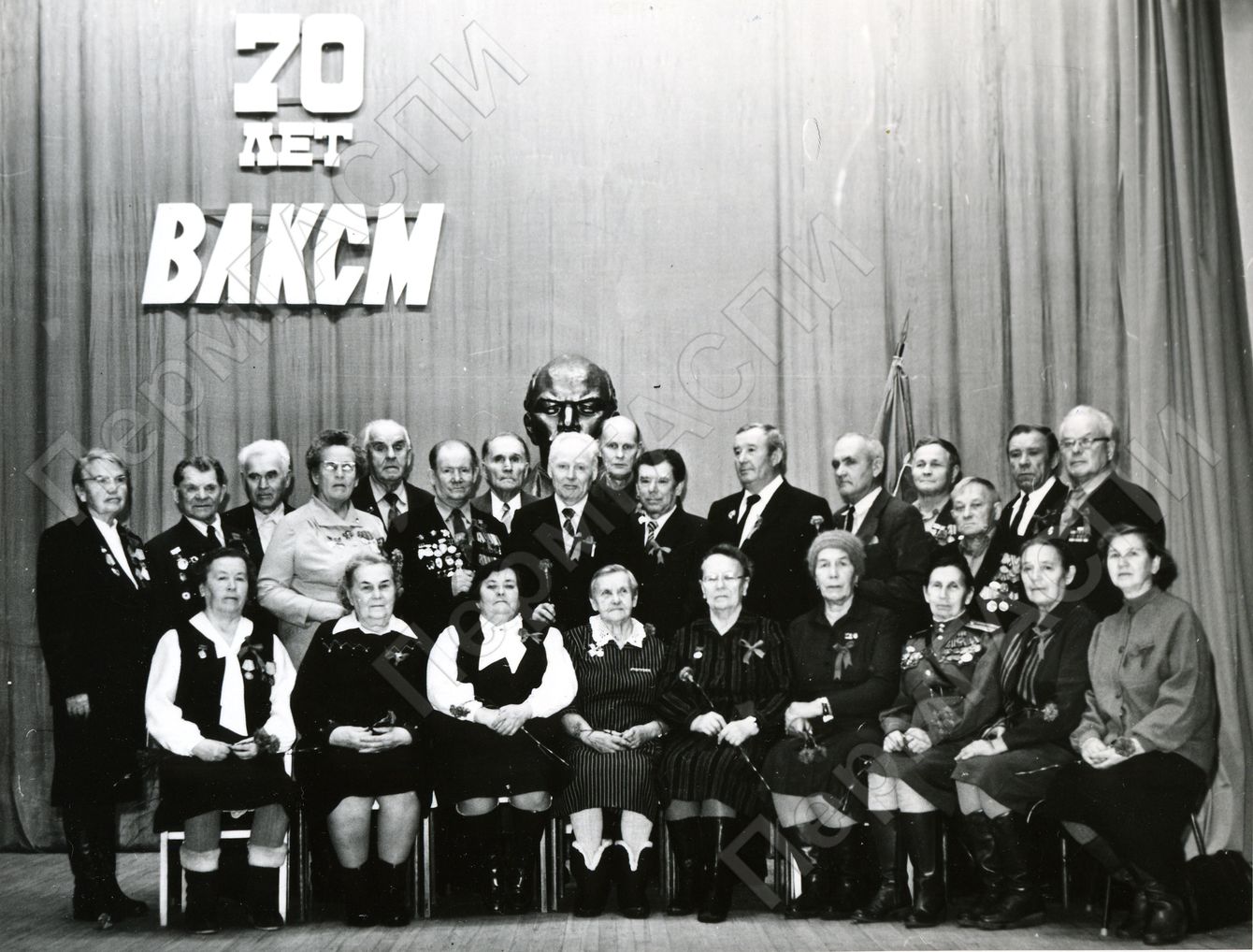 Торжественный вечер, посвященный 70-летию ВЛКСМ. Ветераны комсомола. Клуб "Металлург". 1 ряд (сидят): Воронина Анна Андреевна, Плесских Таисья Моисеевна, Болотова Дина Петровна, Пинаева Зинаида Николаевна, Делидова Мария Алексеевна, Кириллова Евдокия Иосифовна, Сорокина Елизовета Михайловна, Мурашова Лидия Ивановна, Ощегекова Тамара Ивановна. 2-ой ряд: Тягун Мария Михайловна, Власов Александр Андреевич, Ощеиков Алексей Михайлович, Логинава Анна Карповнна, Болотов Михаил Иванович, Деменев Сергей Иванович, Кириллов Иван Сергеевич, Столбов Михаил Иванович, Висталин Юрий Николаевич, Герченков Вениамин Данилович, Слесарев Павел Федорович, Мурашов Николай Владимирович, Щекин Александр Ильич,Колцов Аркадий Аркадьевич, Малыгин Алексей Николаевич, Силин Всеволод Сергеевич.