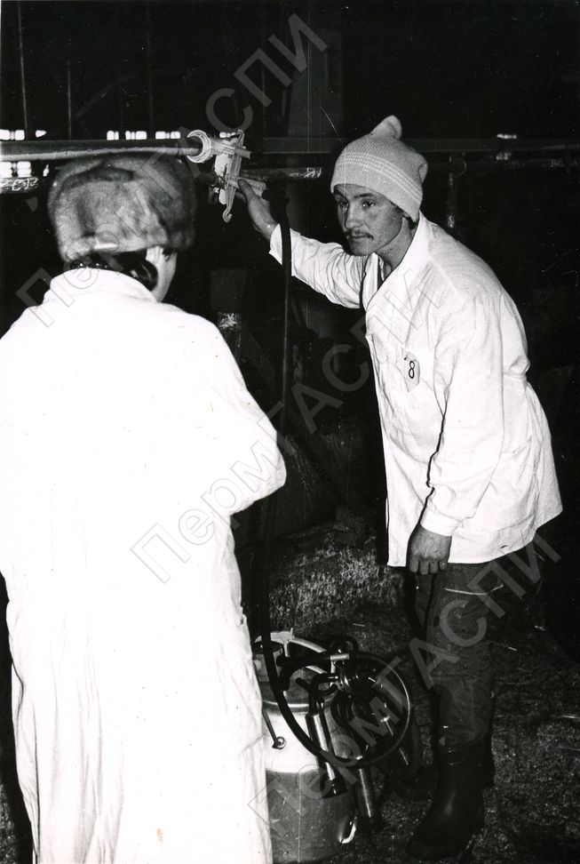 Участник районного конкурса профмастерства молодой дояр совхоза "Правда" Щукин Алесей. Станция Чайковская, Совхоз "Правда", Центральная ферма.