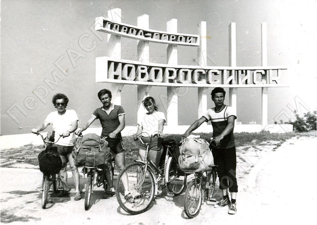 На границе г. Новороссийск ПО "Пермский машиностроительный завод" им. Октябрьской революции. Велопробег Пермь - Сочи - Севастополь - Пермь. (справа на лево) Тарасов В., Тюрина Е., Корякин С., Мошонокий А.