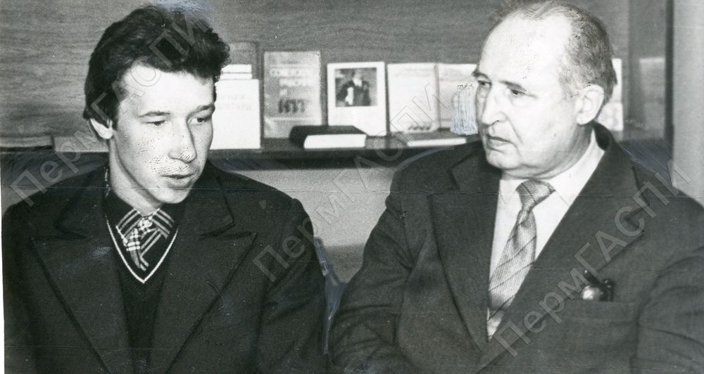 Председатель совета ветеранов Великой Отечественной войны ПО "Пермнефтеоргсинтез" М.В. Берестнев беседует с комсомольцем химзавода А. Деминым, воевавшем в Афганистане