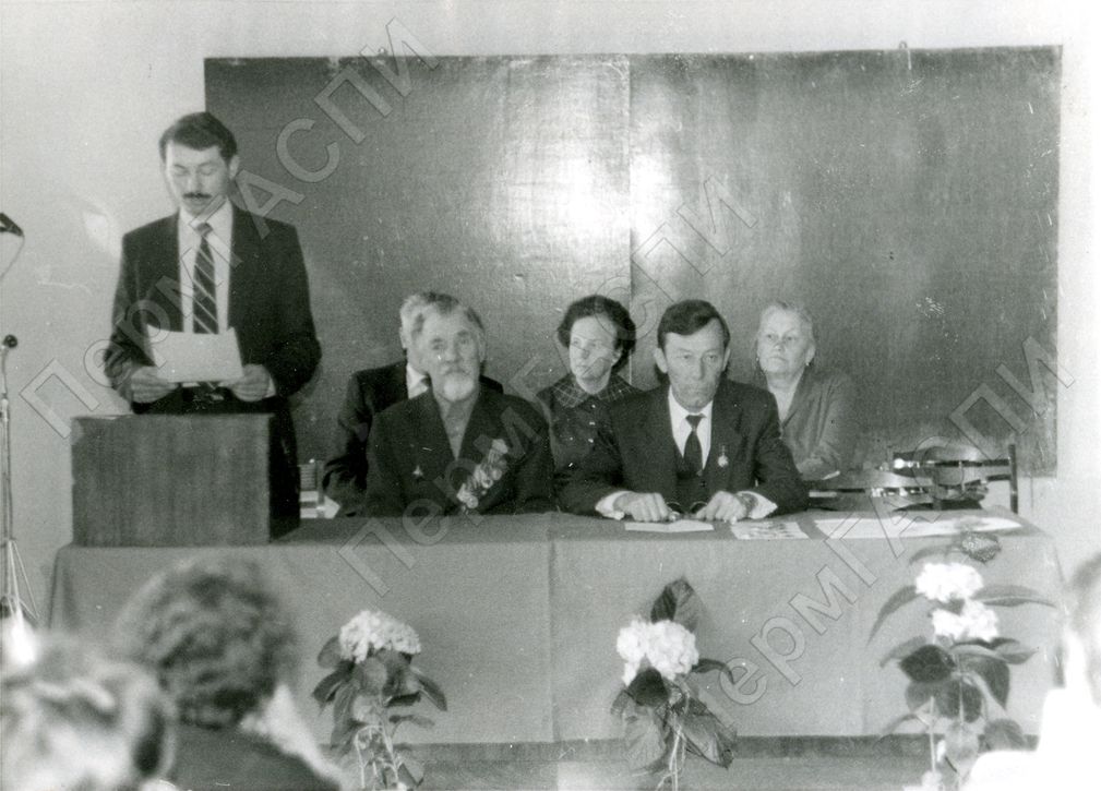 Доклад начальника управления Хвисюка С. М. на торжественном собрании, посвященном 40-летию Победы. Зал заседаний Специализированного пуска наладчика управления по автоматизированным системам управления. В призидиуме ветераны войны и труда - (слева направо) 1 ряд - Сухих А. М., председатель профкома. 2 ряд - ветеран войны, председатель комитета народного контроля управления Ликучев П. Е., Батуева А. А.