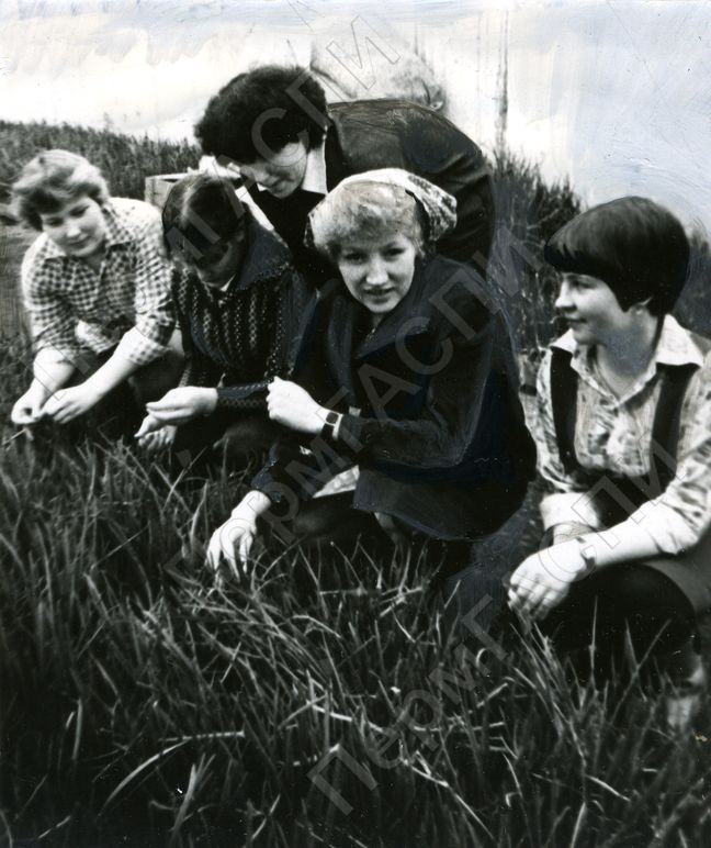 Дудина Алевтина, овощевод, комсорг бригады №2, с практикантами из СПТУ №7, выпускником сама и является. Совхоз "Верхнемуллинский", Пермский район.
