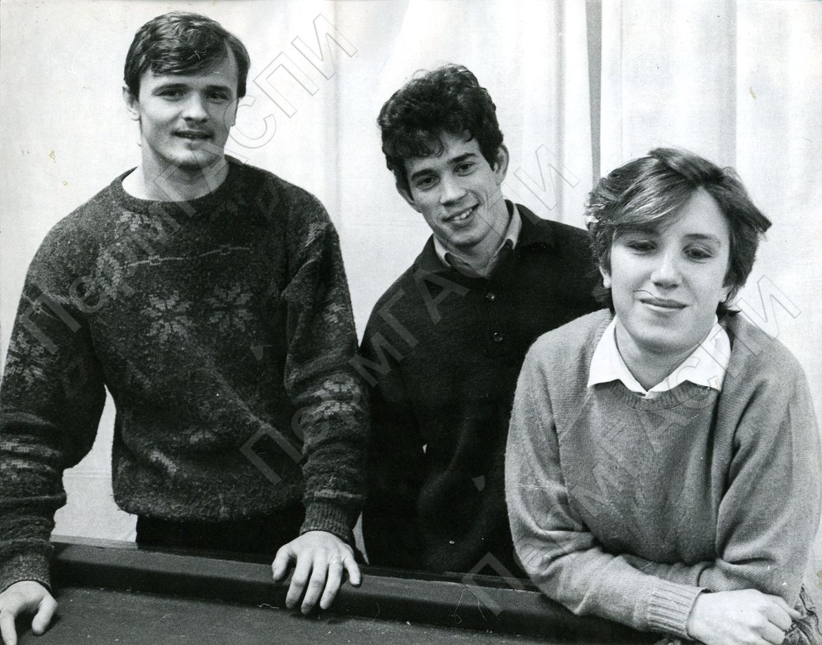 Слева направо: М. Швая - победитель Кубка мира, серебряный призер чемпионата страны, победитель Кубка СССР по борьбе самбо, О. Лебедев - победитель Кубка СССР по борьбе самбо, Т. Бирюкова - обладательница золотой медали по прыжкам в воду на чемпионате мира среди молодежи.