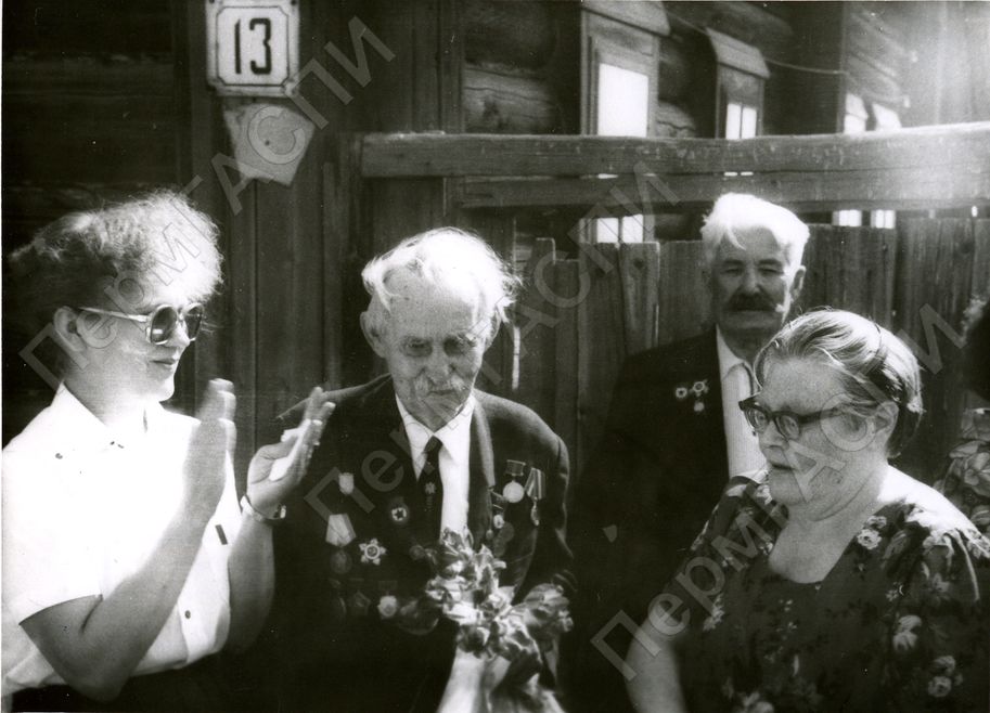 Празднование 90-летия Чердынского музея имени А. С. Пушкина. ул. Ленина д. 13. На фото: директор музея Пьянков С. А., ветеран Великой Отечественной войны, партии и комсомола, бывший директор музея Лунегов И. А., сотрудник музея Кашенина З. И. и Великой Отечественной войны Куимов Н. А.