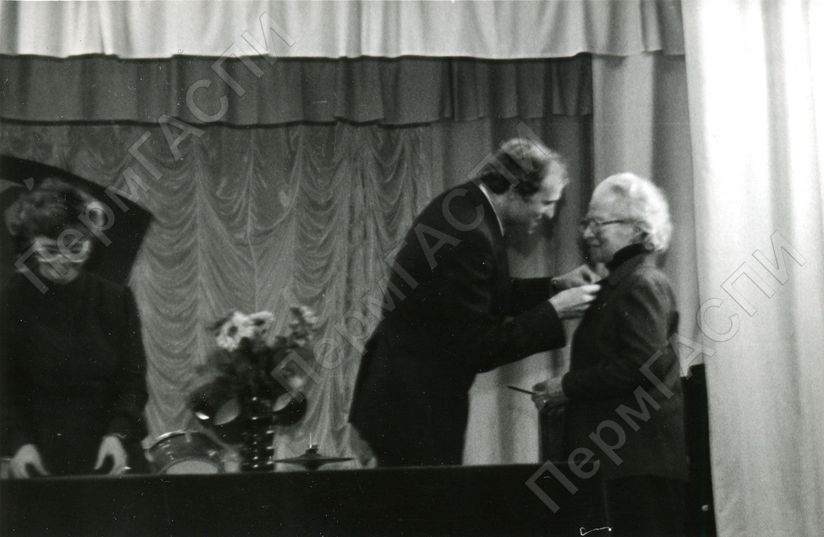 Первый секретарь Большесосновского райкома ВЛКСМ Пащенко Василий Иванович награждает ветерана комсомола Танову А. И. Юбилейным знаком ЦК ВЛКСМ "70 лет ВЛКСМ". Районный дом культуры.