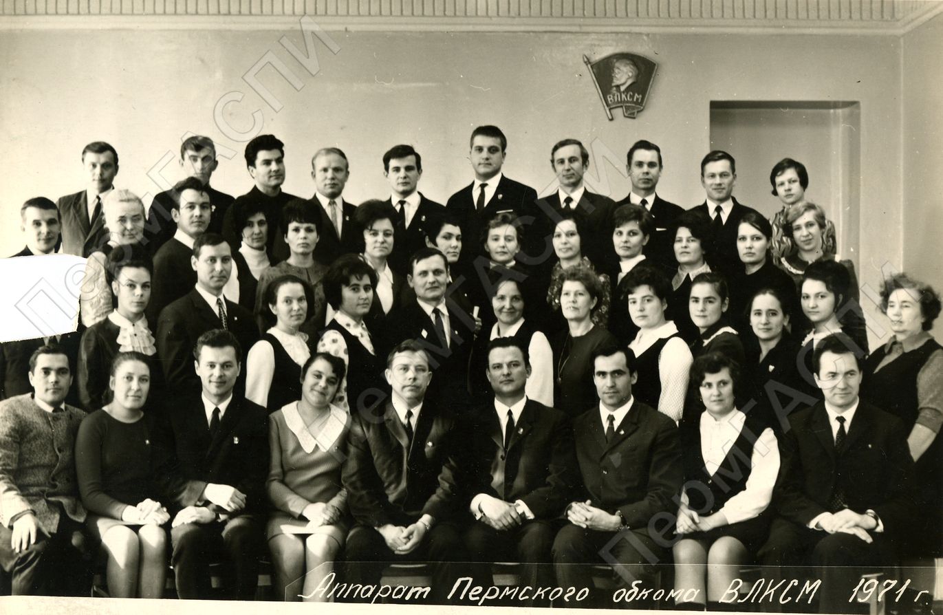 Аппарат Пермского обкома ВЛКСМ. 1 ряд 1) [Дацсон]; 3) Фефелов; 4) Косыпакова; 5) Шестов Ю. В.; 6) Вяткин; 7) Перхун; 9) [Чубунов] 2 ряд 2) Грухина; 3) Муравьев; 4) Мяшкова; 5) Орачева; 6) Живцов; 7) Гущина; 8) Серебренникова; 9) Терешнина; 10) [Скоронок]; 11) Пивоварова; 12) Бакушева; 13) Анисимова Ю. И. 3 ряд 1) Шулепов; 2) Журавлева; 3) Гайнулин; 4) Касанова; 5) Вдовина; 6) Хорикова Г.; 7) Муслимова; 8) Латышева; 9) Бессонова; 10) Лаза; 11) Стахива; 13) Язовских 4 ряд 1) Селетков; 6) Павленко; 7) Балашов; 8) Сапков; 9) Евстифеев; 10) Коньков; 11) Бортникова