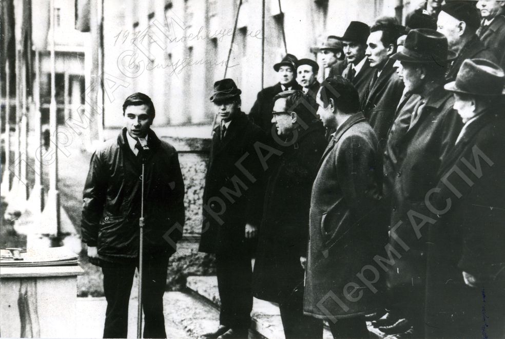 Посвящение в студенты. Выступает секретарь комитета ВЛКСМ Сыропятов Владимир Александрович.