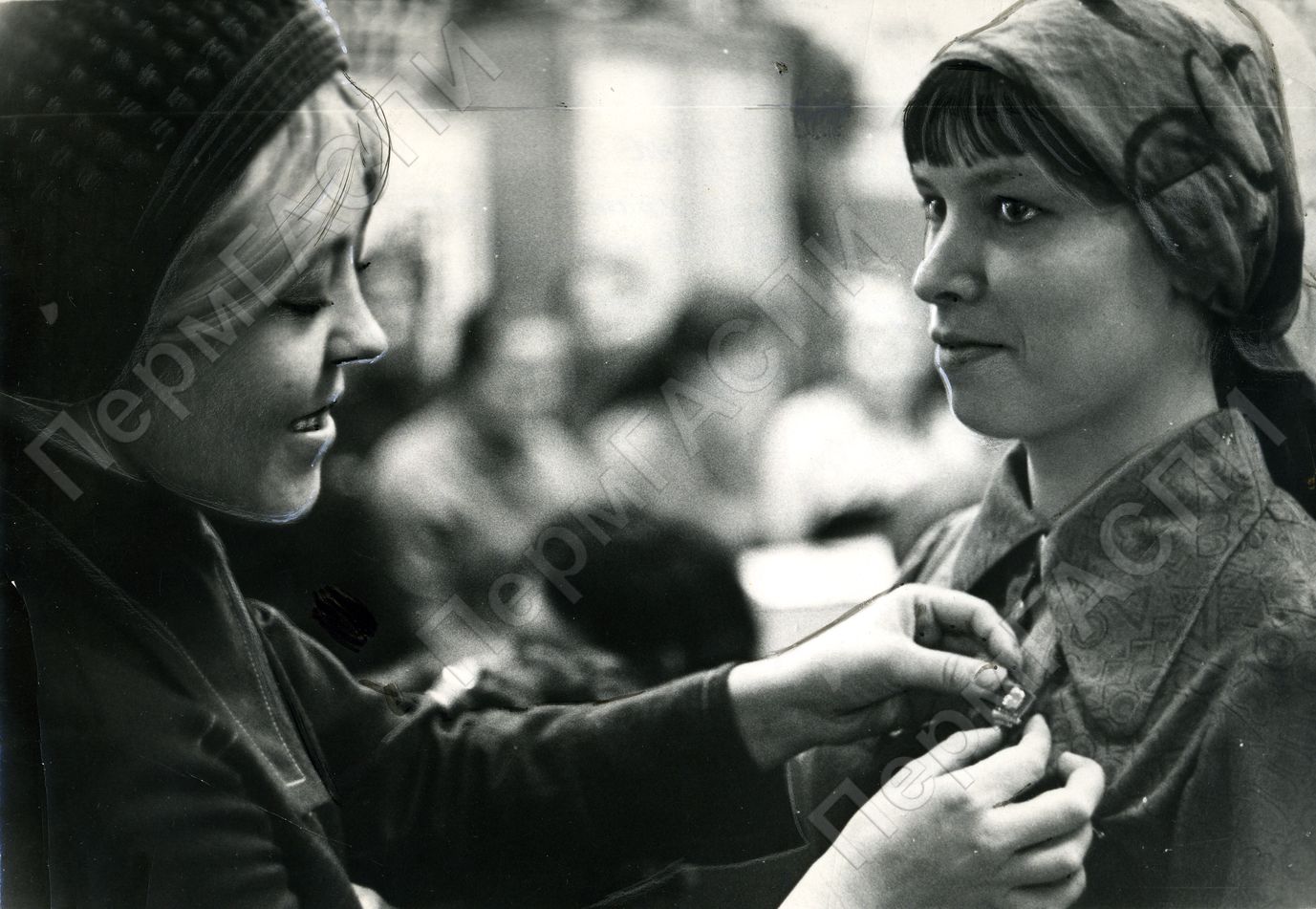 Теплякова Лена - зам. секретаря ВЛКСМ кожевенно-обувного комбината вручает значок Ударник 1973 года Вековшинной Людмила.