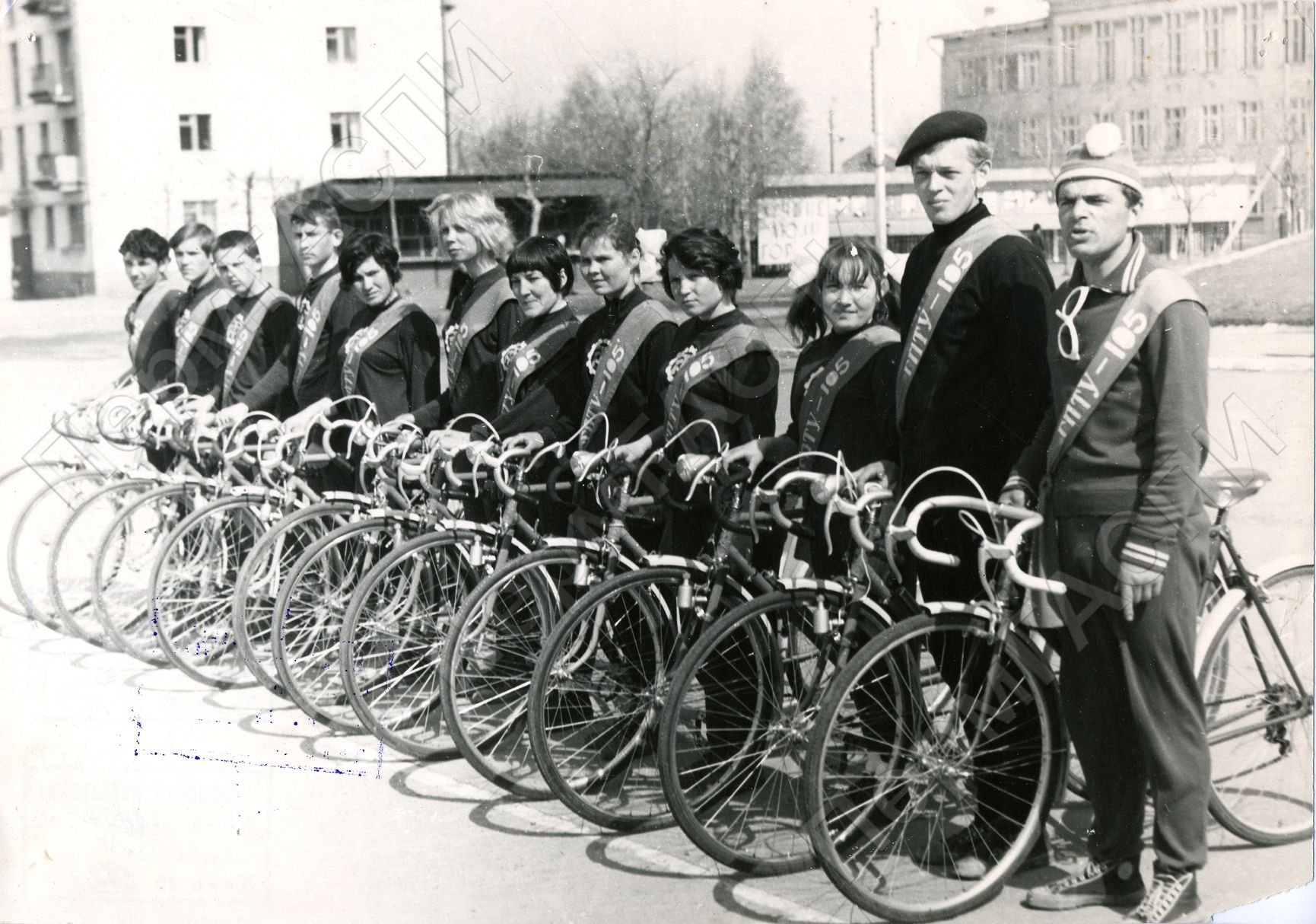 Группа учащихся ГПТУ-105 гор. Чайковского перед стартом велопробега. Второй справа секретарь комсомольской организации училища т. Шашин Николай. Группой совершен пробег по 5-ти районам Пермской области с целью профориентации. Свой велопробег участники посвятили 50-летию со дня присвоения комсомолу имени В. И. Ленина.