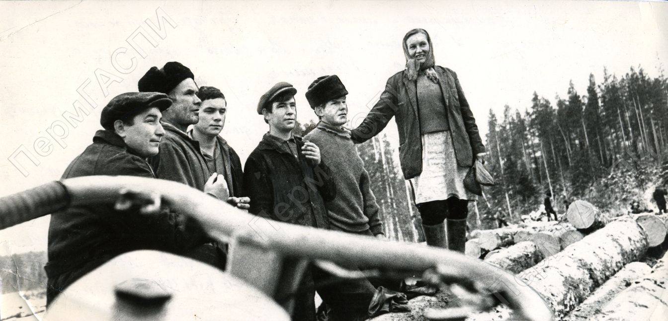 Комсомольско-молодежная бригада нижнего склада Усть-Силайского лесной промышленности Кочевского леспромхоза В. С. Мазунина. Слева направо: мастер нижнего склада И. Н. Кузнецов; бригадир В. С. Мазунин; комсомольцы В. В. Коновалов, И. А. Москалев, Н. Г. Котяшев, Н. Ф. Курзина.