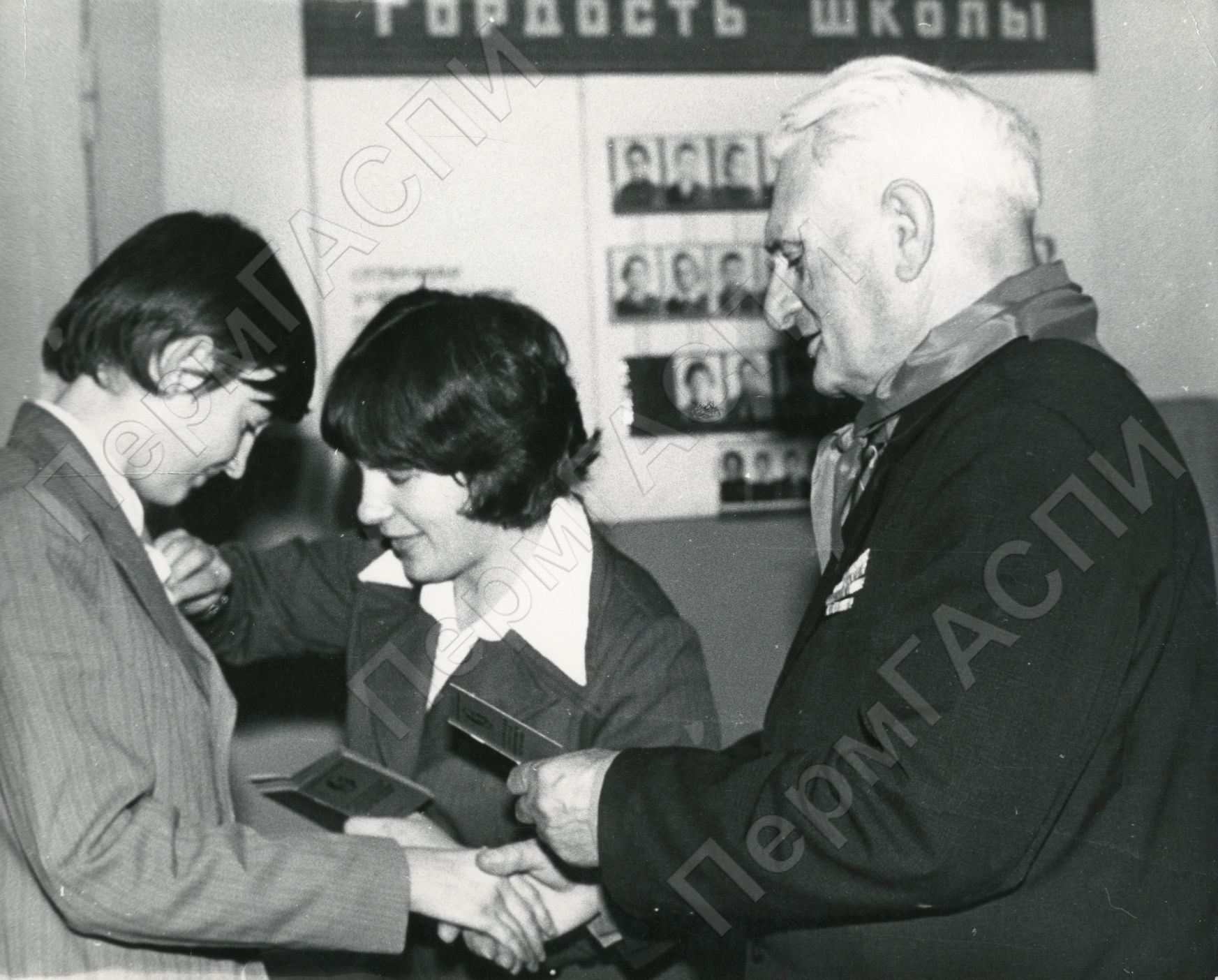 Гордость школы. Комсомольский билет вручает член подпольного Ворошиловского обкома партии М. И. Третьякевич (брат Виктора, молодогогвардейца). Снимок сделан в Оханской восьмилетней школы. Соснин Андрей. Фотокружок Оханского дома пионеров.