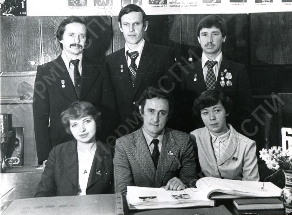 Делегаты 19 съезда ВЛКСМ Свердловского района. т. т. Грибанов П. В. - 1 ряд в центре; Свиридова Л. В.1-я слева; Берестнева Ф. А. на встрече с лауреатами премии Ленинского комсомола т. т. Шиховым, Жуковым, Килуниным в музее по истории Комсомольской организации свердловского района.