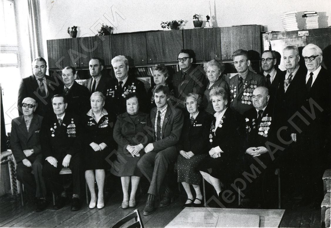 Состав Совета ветеранов Мотовилихинского района - 1982-83 год. 1-й ряд слева направо: Дружинина Ч. Г., Кузовникова З. М., Ворожко В. А., II секретарь РК ВЛКСМ - Михайлов А. Л., Кочурова К. Ф.,Сивилева З. М., Родионов И. Я. 2-й ряд: Зац М. И., Гипев Е. Н., Пискунов, Ворожко А. А., Грацинская О. Г., [Журавлев] Е. А., Новикова Т. Д., Левкин, Шафиев Н. Н., гость из Москвы Дижннков, Хорьков В. И.