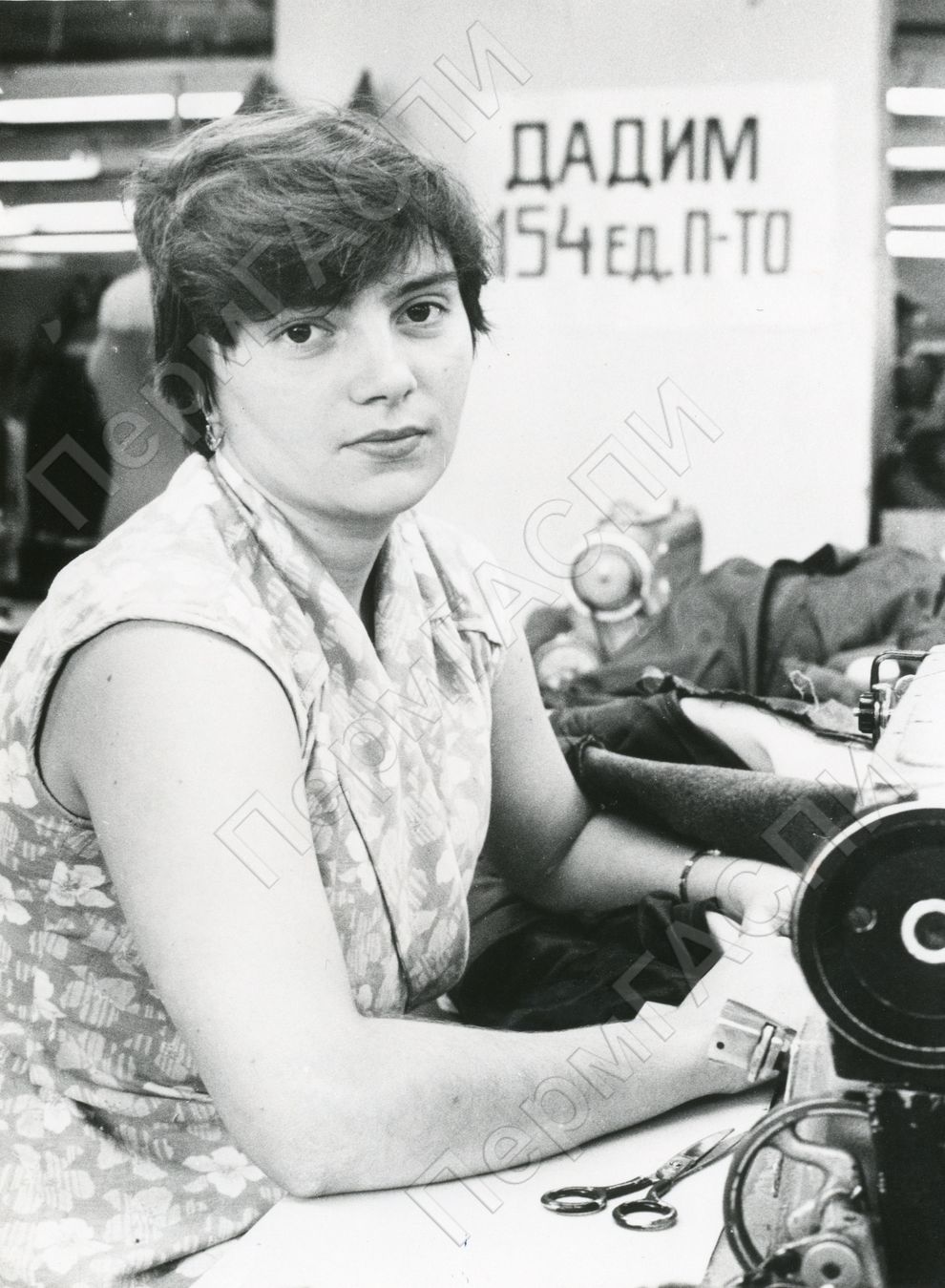 Комсомольско-молодежный субботник, посвященный Дню рождения комсомола. Обухова О. выполняет обязательство выполнить норму на 120 %. ПО "Пермодежда"