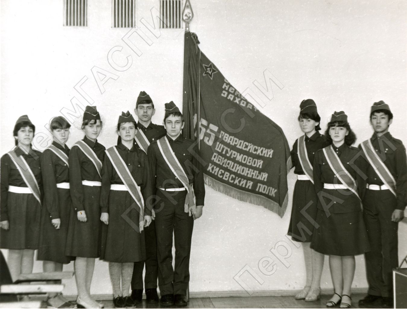 Лучшие комсомольцы у знамени 155 гвардейского штурмового авиационного полка. Акция "Равнение на Знамя Победы!".