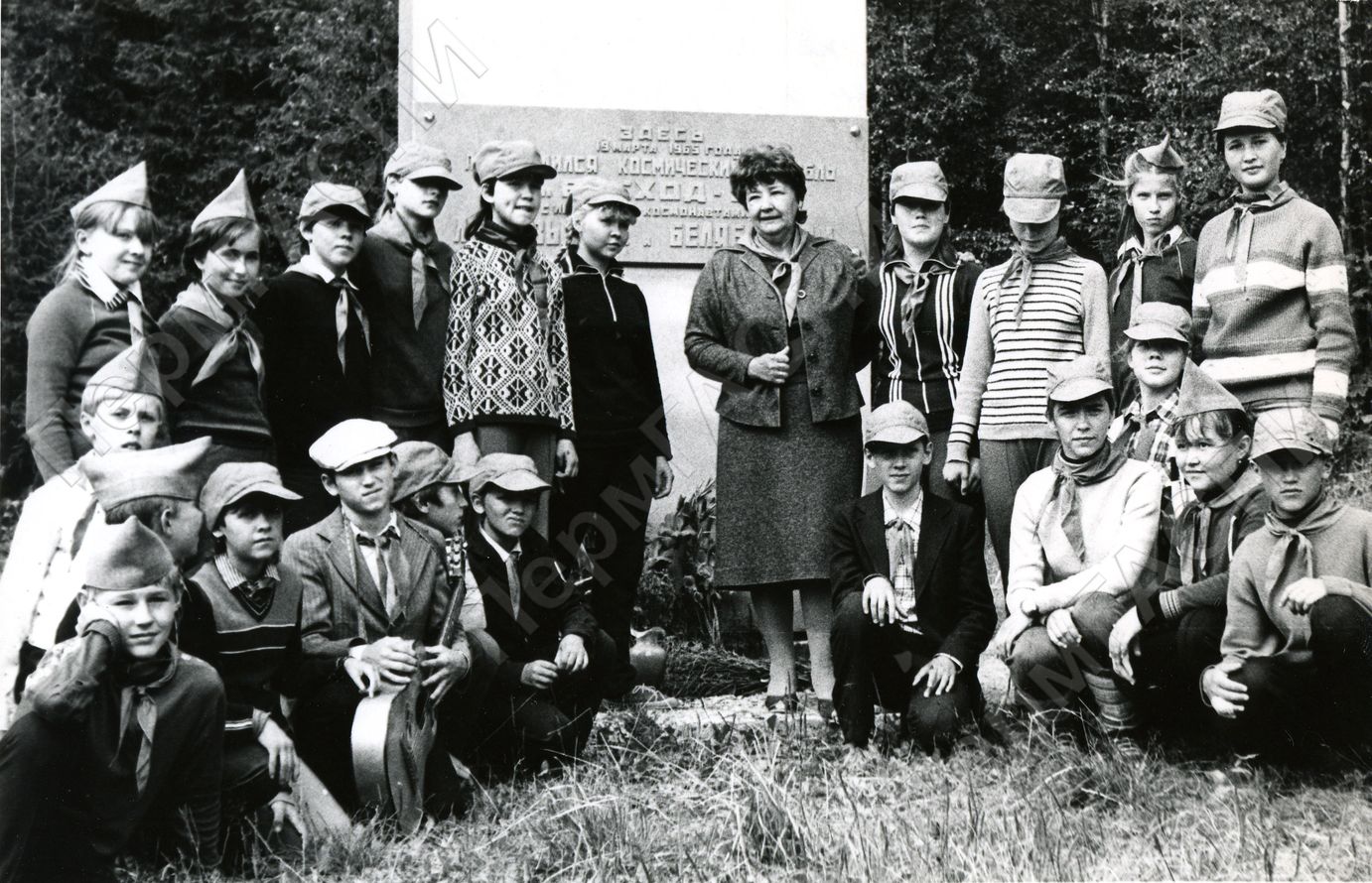 На месте приземления космического корабля "Восход" в 50 км от Березники. Жена космонавта Беляева на встрече с пионерами.