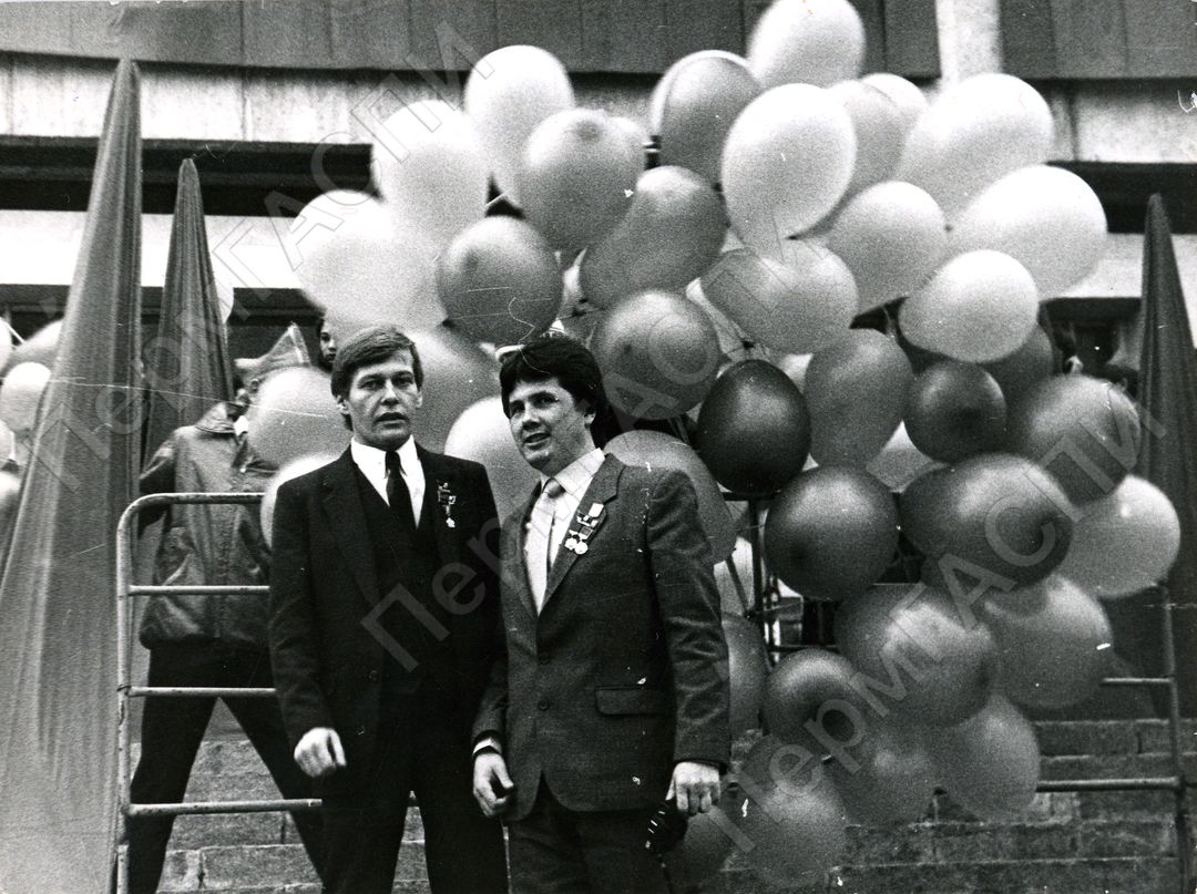 XX съезд ВЛКСМ, делегаты города Березники 1-й секретарь УК ВЛКСМ Ю. П. Черданцев, шахтер ПО "Уралкалий" И. Ф. Чакилев.