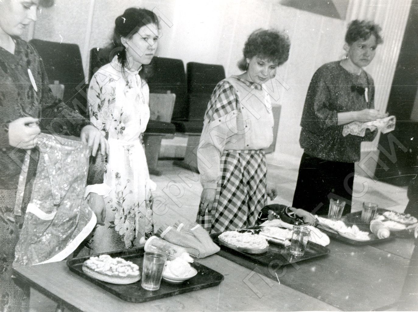 Городской конкурс "А ну-ка девушки". 1. Хлынина Елена - торг. 2. Бадрутдинова Розалия - ЖБК-5 3. Зиновьева Валентина - з/с №7, Чусовской металлургический завод 4. [Бакилева] Вера - шв. мастер, ж/д узел - победитель конкурса. Организатор ГК ВЛКСМ (Чусовой).
