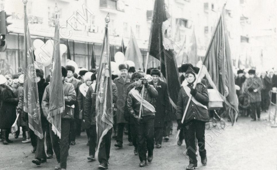 Праздничная демонстрация учащихся Мотовилихинского СПТУ-26. Комсомольский пр.