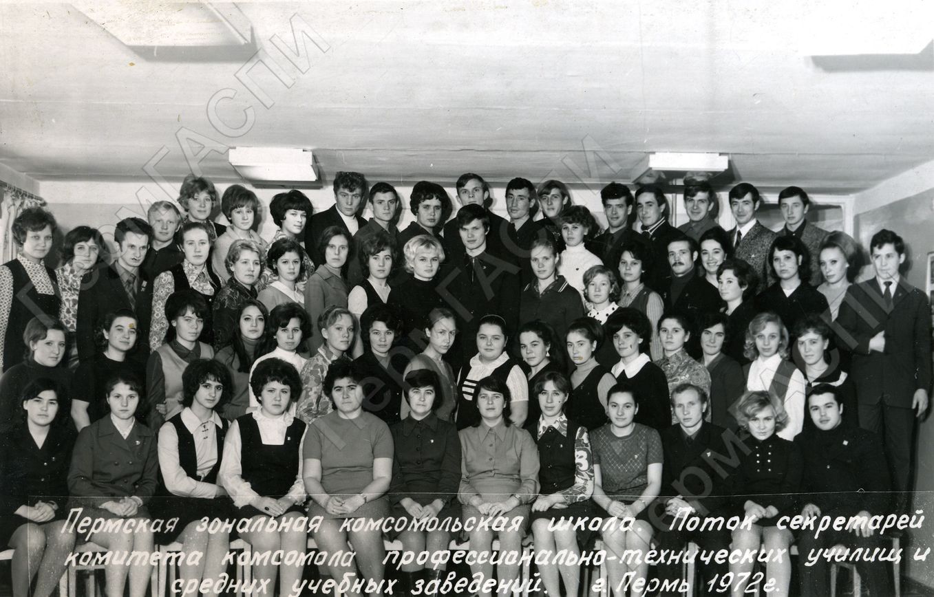 Занятия в Зональной комсомольской школе. Поток секретарей комитета комсомола ПГУ и средних учебных заведений. 1 ряд 1. Нурлива Елизавета - Пермская область 2. Шадрина Лидия - Удмурская АССР 3. Пиналова Ольга 4. Хамитова Фая 9. Пегулина Валя - Кировская область 10. Мазуров Саша - Кировская область 11. Чарушникова Тамара - Кировская область 12. Марков Владимир - Кировская область 2 ряд 1. Люосева Валя - Коми АССР 2. Чупахина Валя - Коми АССР 3. Спасенова Вера - Коми АССР 4. Шагабутдинова Неля - Пермская область 5. Крашевина Вера - Пермская область 6. Черепанова Нина - Пермская область 7. Елькина Алевтина - Пермская область 8. Якимова Нина - Кировская область 9. Соболева Татьяна - Кировская область 10. Рага Саша - Кировская область 11. Габова Надя - Пермская область 12. Россомахина Валя - Удмурская АССР 13. Маланина Таня - Удмурская АССР 14. Цемищева Люда - Кировская область 15. Михеева Ира - Кировская область 16. Долгоарминных Неля - Кировская область 3 ряд 2. Гусева 3. Мроханович Виктор - Коми АССР 4. Кочеткова Надя - Коми АССР 5. Смирнова Люда - Коми АССР 6. Енокян Наташа - Коми АССР 7. Тренева Люда - Коми АССР 8. Вдовина Вера - Удмурская АССР 9. Дыкая Любовь - Пермская область 10. Хориков Леонид - Кировская область 11. Емельянова Раиса - Кировская область 12. Безверхняя Ольга - Удмурская АССР 13. Салахова Таня - Удмурская АССР 14. Мацышина Вера - Удмурская АССР 15. Латынов Роман - Удмурская АССР 16. Беккер Валя - Пермская область 17. Солоденкина Нина - Удмурская АССР 18. Сохлова Таня - Удмурская АССР 19. Лаюкс Тамара - Пермская область 20. Богомягков Василий - Пермская область 4 ряд 1. Пасека Василий - Коми АССР 2. Зиганмина Валентина - Пермская область 3. Лепешкина Анна - Пермская область 4. Калашникова - Пермская область 5. Чучалин Георгий - Кировская область 6. Максимов Женя - Пермская область 7. Русинова Валя - Пермская область 8. Кузнецов Володя - Кировская область 9. Тронин Николай - Удмурская АССР 10. Новиков Виктор - Коми АССР 11. Чекунов Валентин - Коми АССР 12. Зеленит Юрий - Пермская область 13. Ахальцев Борис - Пермская область 14. Павлов Анатолий - Коми АССР 15. Малых Юрий - Кировская область
