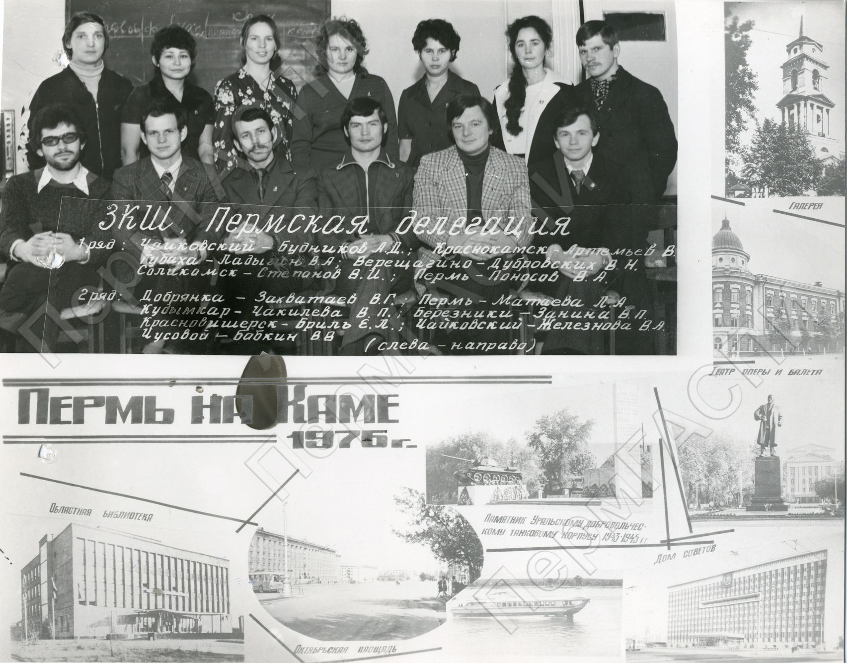 Групповые фотографии слушателей Пермской зональной комсомольской школы. (слева - направо) 1 ряд: Чайковскай - Будников А. Д., Краснокамск - Артемьев В., Губаха - Ладыгин В. А., Верещагино - Дубровских В. Н., Соликамск - Степанов В. И., Пермь - Поносов В. А. 2 ряд: Добрянка - Захватаев В. Г., Пермь - Матаева Л. А., Кудымкар - Чакилева В. П., Березники - Занина В. П., Красновишерск - Бриль Е. Л., Чайковский - Железнова В. А., Чусовой - Бабин В. В.