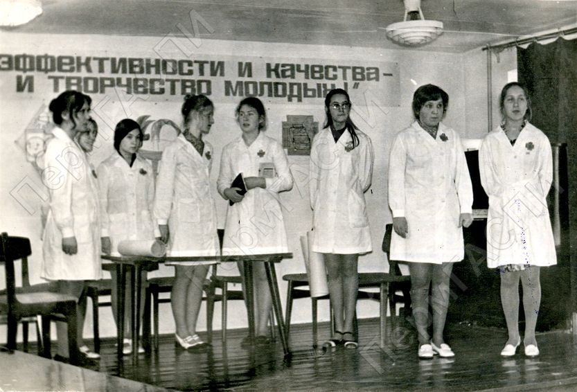 Конкурс лучшего по профессии на лаборантском отделении. Крайняя справа-комсорг группы III фельдшеров-лаборантов "А" Белоусова Лариса.