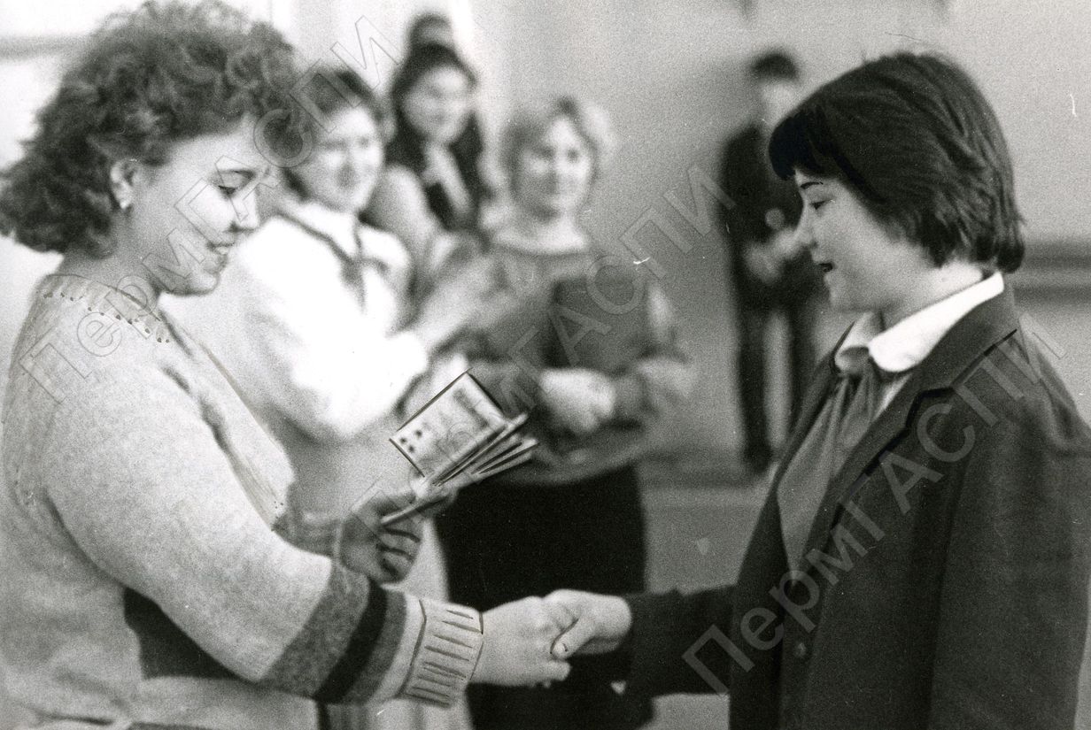 Секретарь РК ВЛКСМ Мишина вручает комсомольский билет Наде Субботиной, школьнице Усть-Качкинской средней школы.