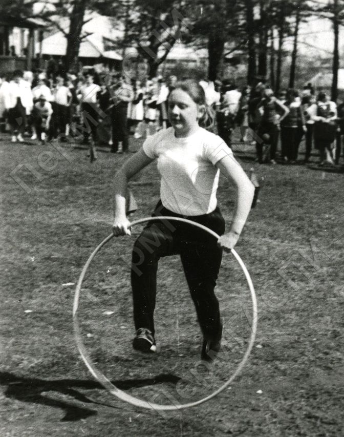 Соревнования сивинских школьников Веселый старт. Девочка, бегущая с кругом.