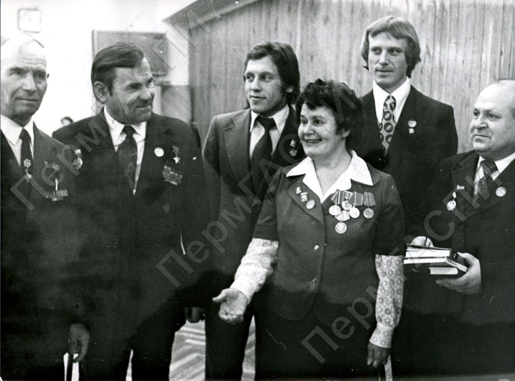 Ветераны комсомола г. Губахи Полежаев И.И., Николов И.Я., Кроглова В.И., Васильев А.М. беседуют с комсомольцами.
