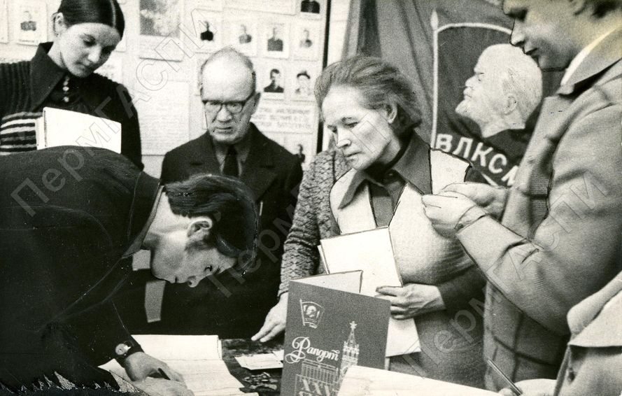 Член Совета музея и райсовета ветеранов Голдобин Алексей Казанович подписывает рапорт УК КПСС в связи с 60-летием ВЛКСМ.