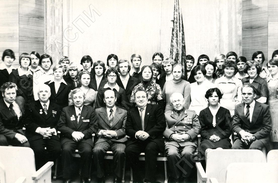 Ветераны партии, комсомола и молодежь после торжественного посвящения в рабочий класс Очерского машиностроительного завода. Сидят слева: секретарь парткома машзавода т. Пятков А.А., ветеран труда, комсомола, партии и войны т. Бояршинов Т. А. председатель райсовета Бессонов Т.И., I секретарь РК КПСС т. Котельников Р. А., директор машзавода т. Попинхронов К.П., генерал-полковник, Герой Советского Союза Крелов Аркадий Федорович.