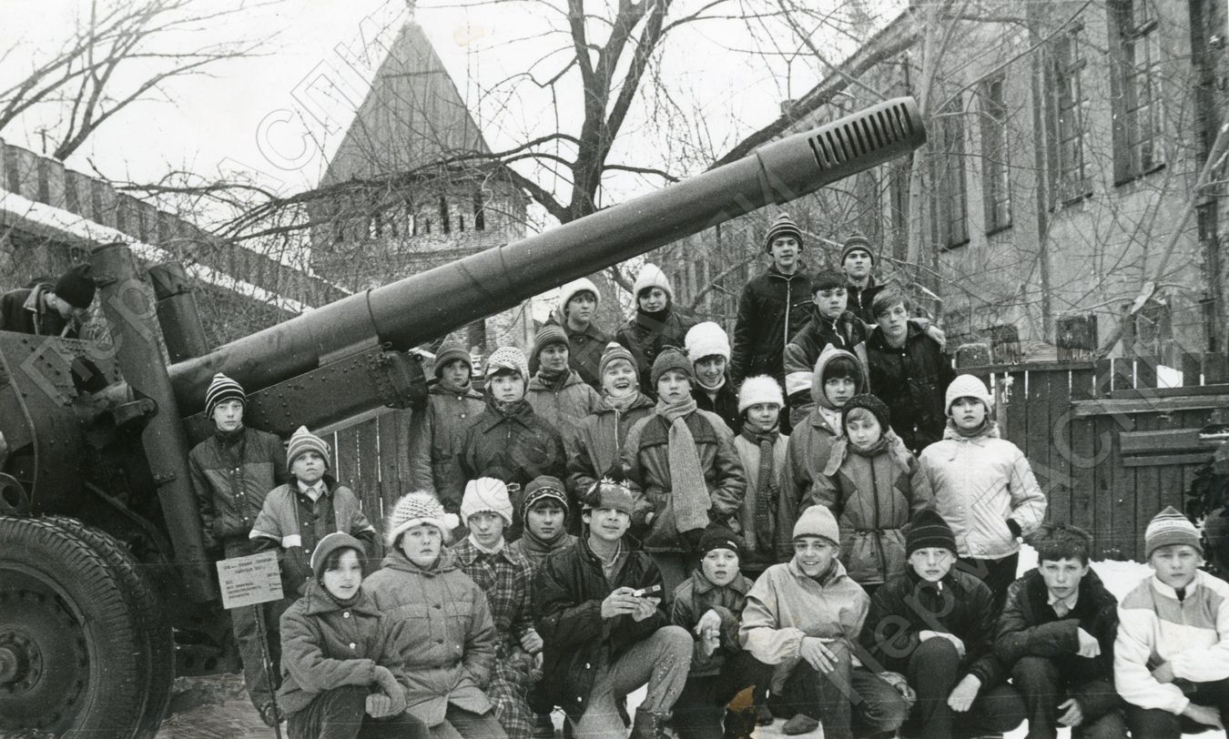 Следопыты группы "Поиск" из мотовилихинской школы № 105 у 152-мм пушки-гаубицы