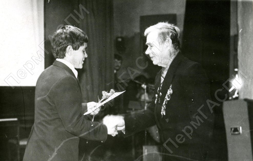 I секретарь Верещагинского РК ВЛКСМ Пинаев Александр Павлович вручает памятный сувенир старейшину коммунисту райкома Зенкову Дмитрию Александровичу.