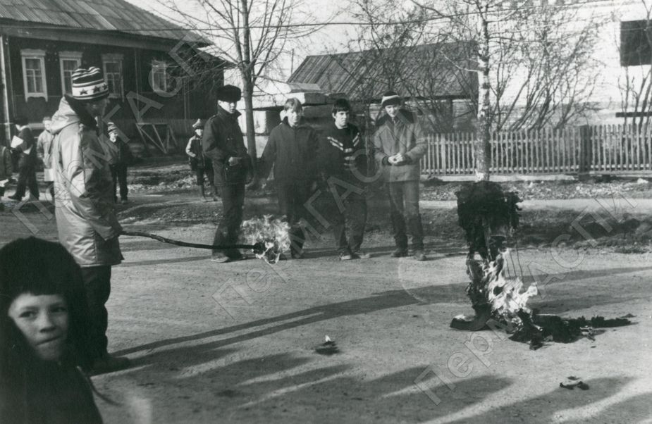 Учащиеся Косинской средней школы, участники активного митинга сжигают чучело войны