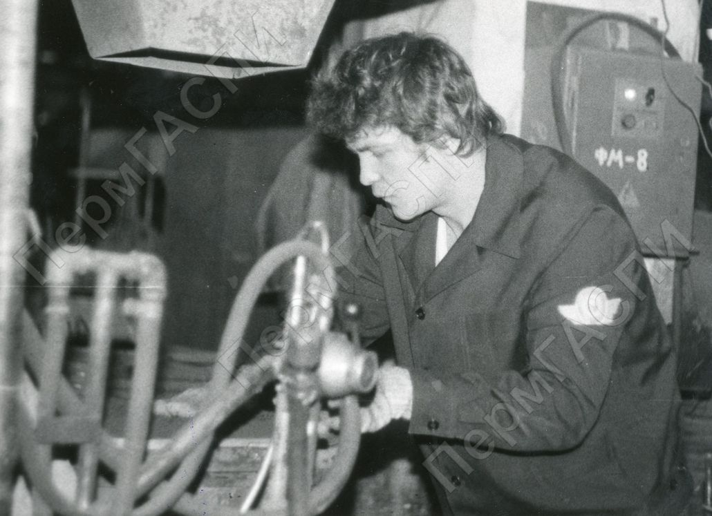 Субботник, посвященный XX съезду ВЛКСМ. У пресса работает заместитель начальника цеха 11, пропагандист комсомольской политсети Андриянов В.В. ПО "Моторостроитель" им. Я.М. Свердлова
