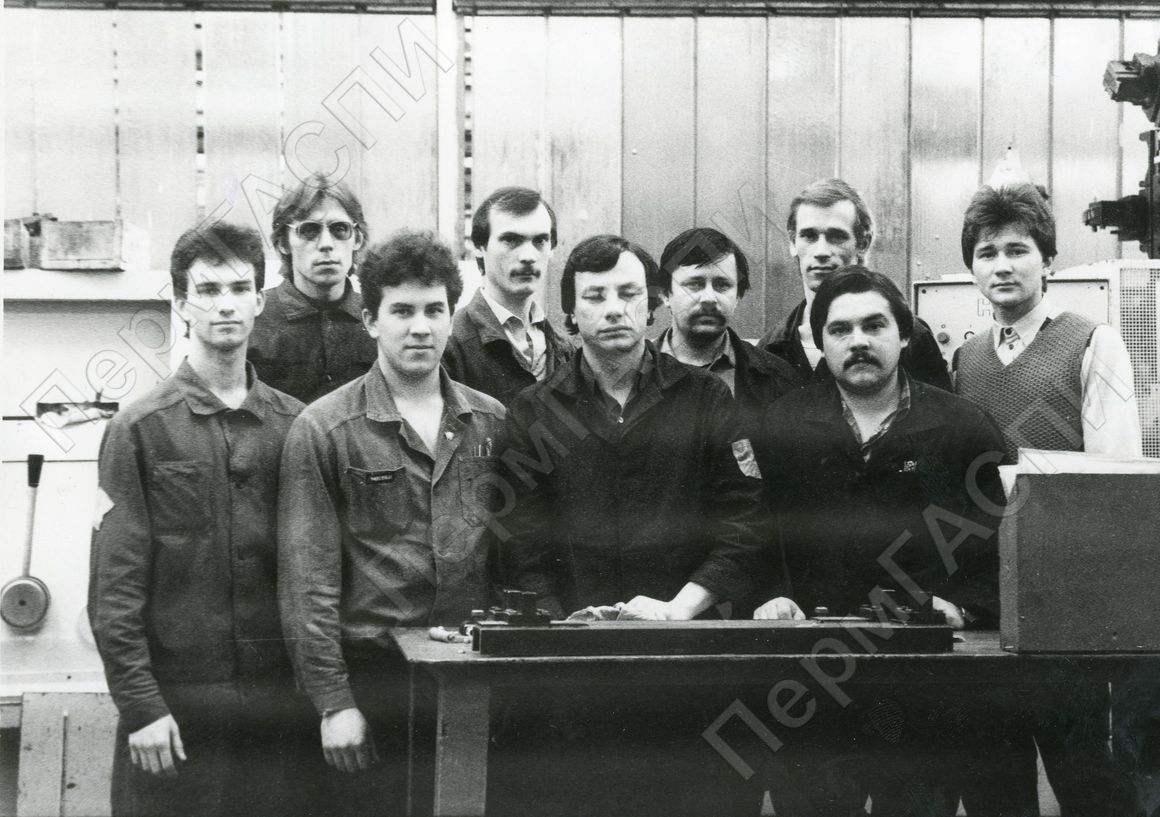 Комсомольско-молодежная бригада Ю. Кожина - победитель Приза-вызова в честь XX съезда ВЛКСМ. Цех 44 ПО "Моторостроитель" им. Я.М. Свердлова