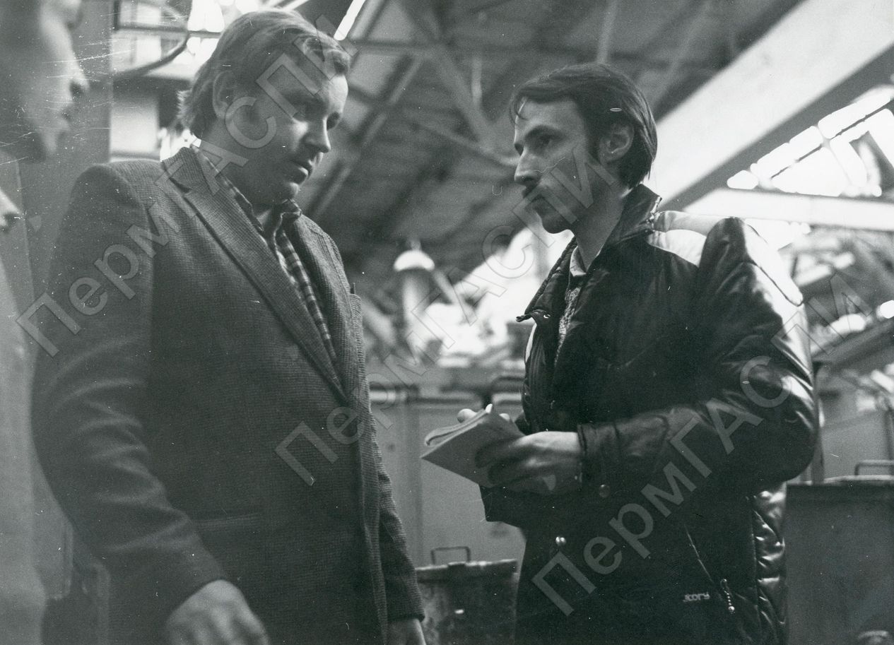 Корреспондент многотиражной газеты "Ленинский путь", член комитета ВЛКСМ Никитин А.И. беседует с заместителем начальника цеха 33 Астаховым Б.И. Цех 4. ПО "Моторостроитель" им. Я.М. Свердлова.