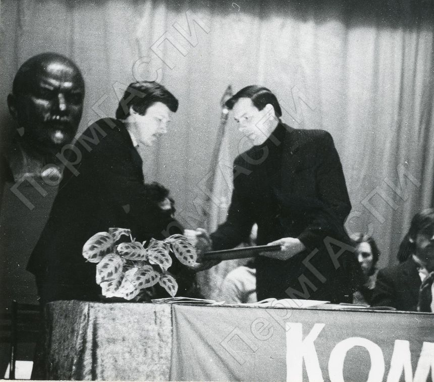 Слет победителей соцсоревнования по достойной встрече XXVII съезда КПСС. Первый секретарь Кишертского райкома ВЛКСМ Галкин В.М. передает Рапорт районной комсомольской организации Кузнецову В.А.