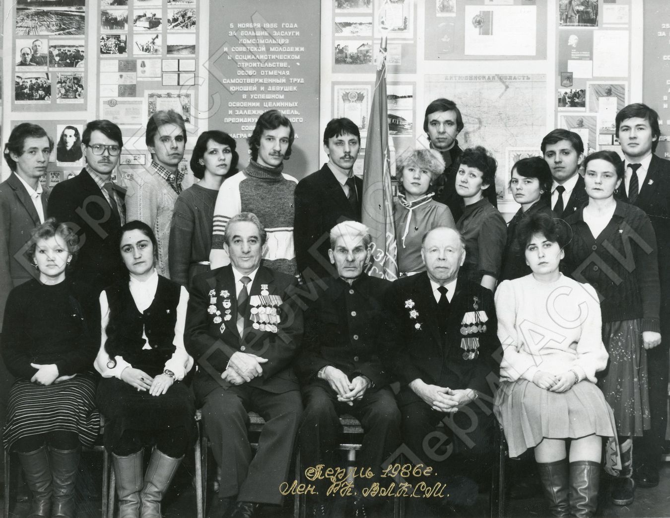 Представители комсомольской организации телефонного завода, подписавшие рапорт районной Ленинской комсомольской организации XXVII съезду КПСС. Музей комсомольской организации Ленинского района