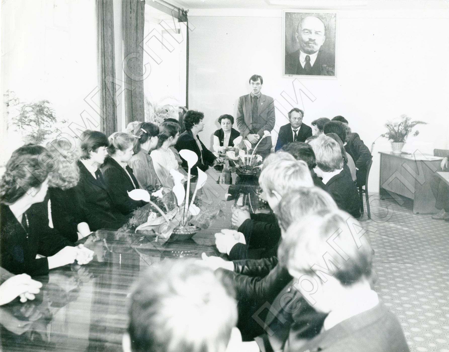 Участники встречи комсомольского актива, лучших молодых рабочих с аппаратом горкома КПСС и ВЛКСМ. Выступает первый секретарь горкома ВЛКСМ Ковалев Олег Алексеевич