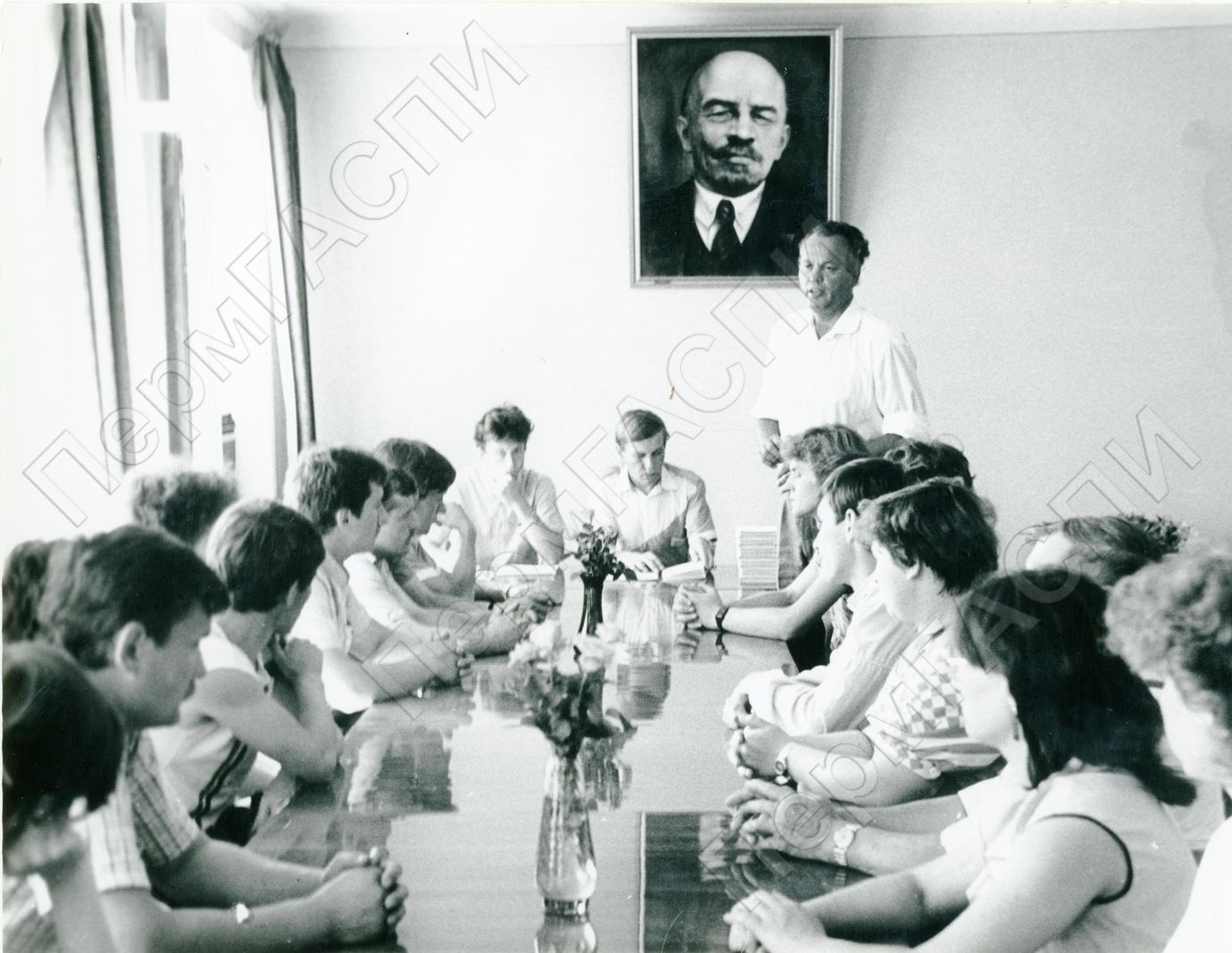 Встреча молодых рабочих и комсомольских работников, чьи портреты помещены на городскую Доску комсомольской славы в ГК КПСС с I секретарем Березниковского горкома КПСС Агалаковым В.А. Выступает Агалаков В.А.
