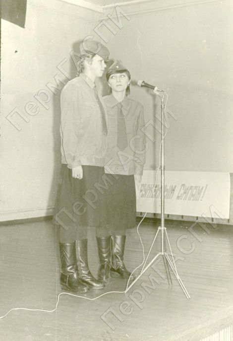 Выступление на концерте студентов БХМТ в подшефной воинской части ракетных войск. Вокальный дуэт Цидвинцева Светлана и Мухаметханова Светлана