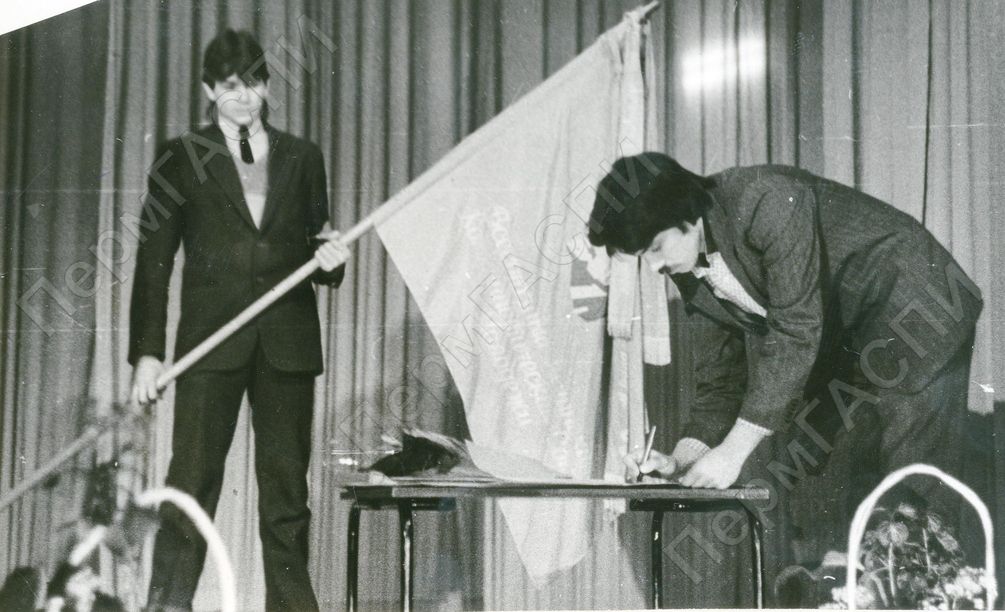 Победитель социалистического соревнования титаномагниевого комбината т. Береснев Е.В. подписывает Рапорт комсомольской организации XXVII съезду КПСС
