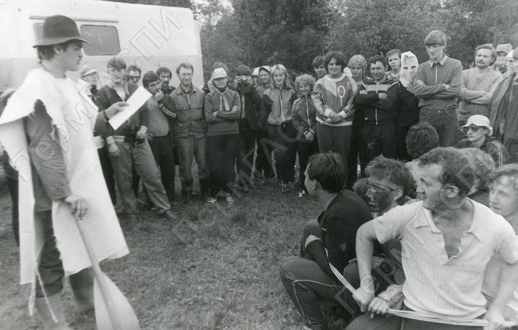 X заводской туристический слет. Момент традиционного ритуала "Посвящение в туристы". Клятву читает Карлюк М - член комитета ВЛКСМ химзавода. Район реки Извер