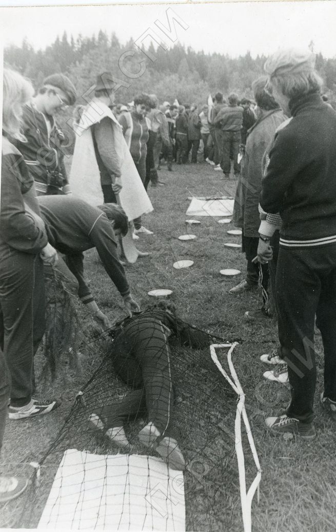 X заводской туристический слет. Момент традиционного ритуала "Посвящение в туристы" - преодоление препятствий. Район реки Извер