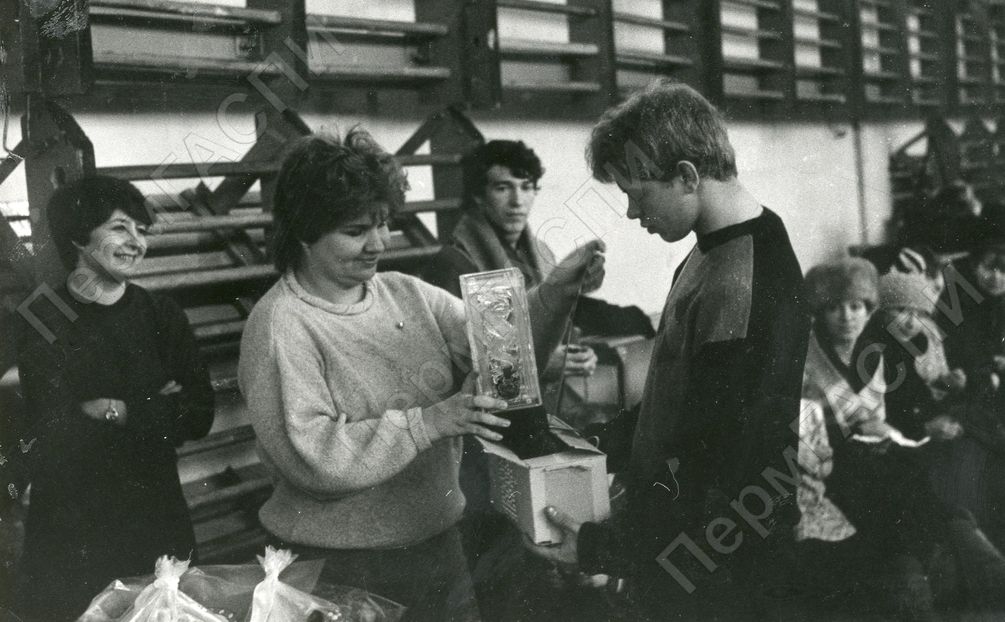 Заводской конкурс "А ну-ка, парни!", посвященный 70-летию ВС СССР. Главный приз вручает секретарь комитета ВЛКСМ БХЗ Романенкова Л. победителю конкурса Коновалову Андрею. Дом спорта "Спектр" Березниковского химзавода