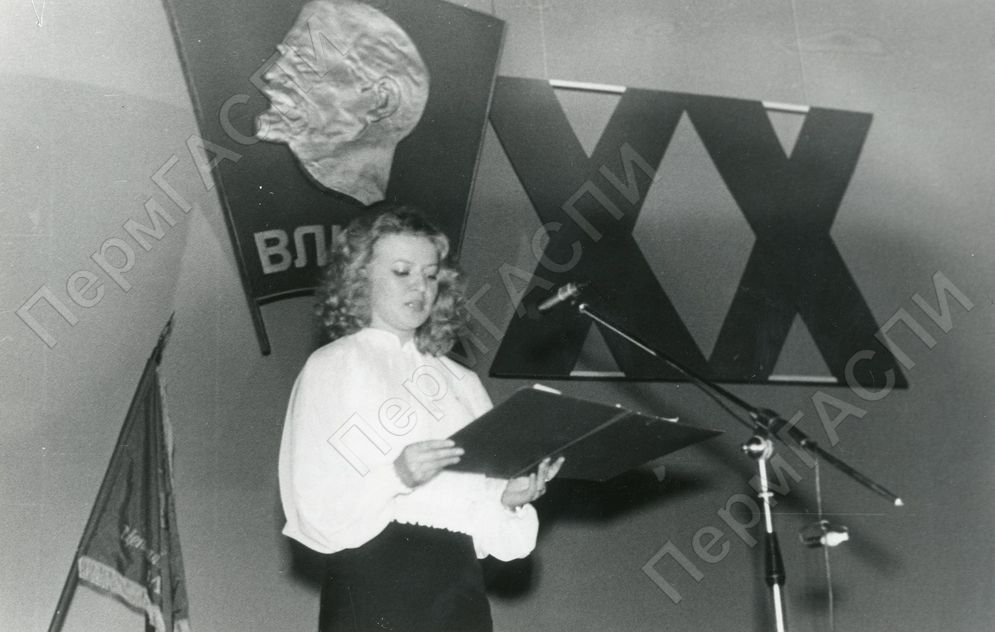 Торжественный вечер, посвященный XX съезду ВЛКСМ, ведущая вечера Предеина 3. - командир педагогического отряда объединения "Азот"