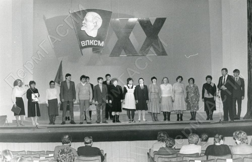 Выступление директора объединения Петруняка Михаила Адамовича на торжественном вечере, посвященном XX съезду ВЛКСМ. На сцене - победители соцсоревнования. ПО "Азот"