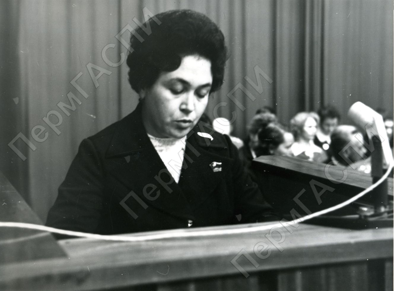 Винокурова С.С. – секретарь парткома Кунгурского обувного комбината. Выступает на 28-й городской партконференции.