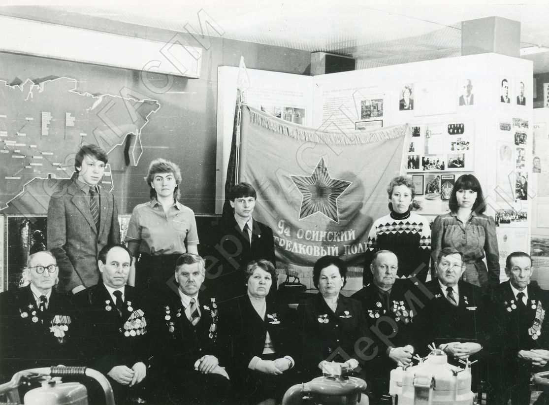 Всесоюзная акция "Равнение на знамена Победы". Молодые передовики производства с ветеранами войны и труда у знамени 9-го Осинского стрелкового полка. Музей ПО "Машзавод им. Ф. Э. Дзержинского"